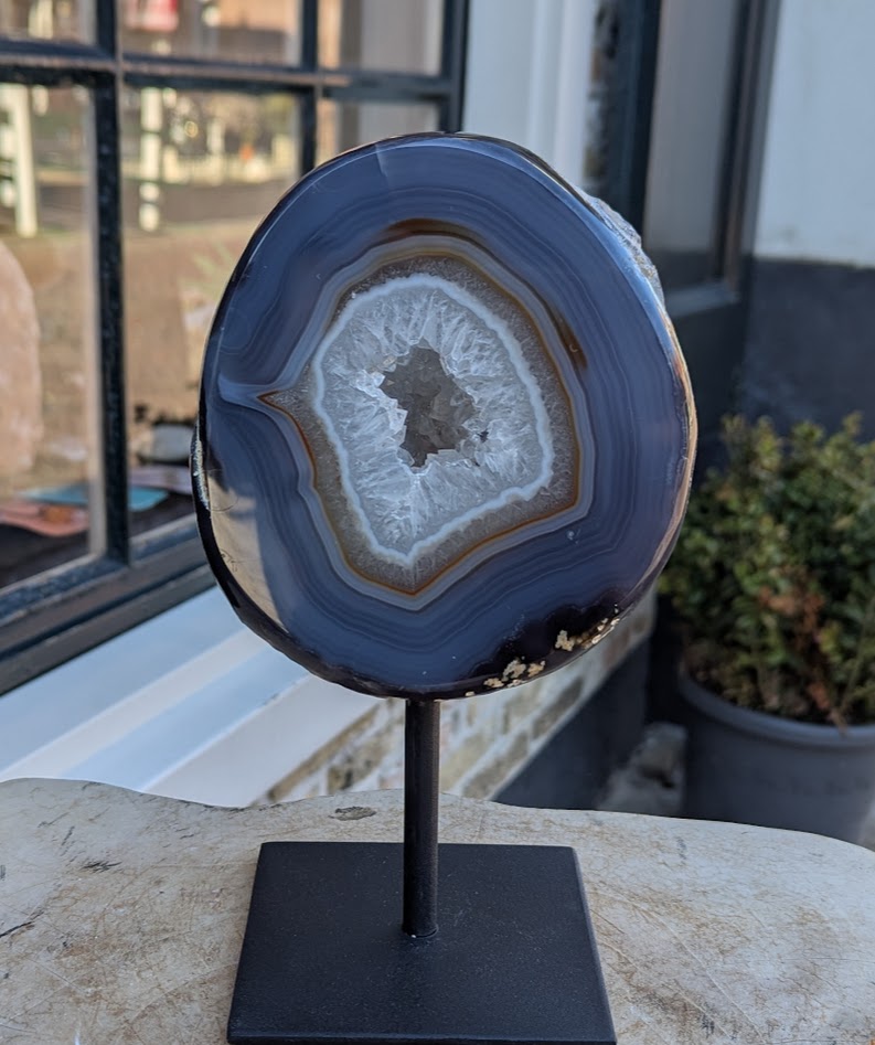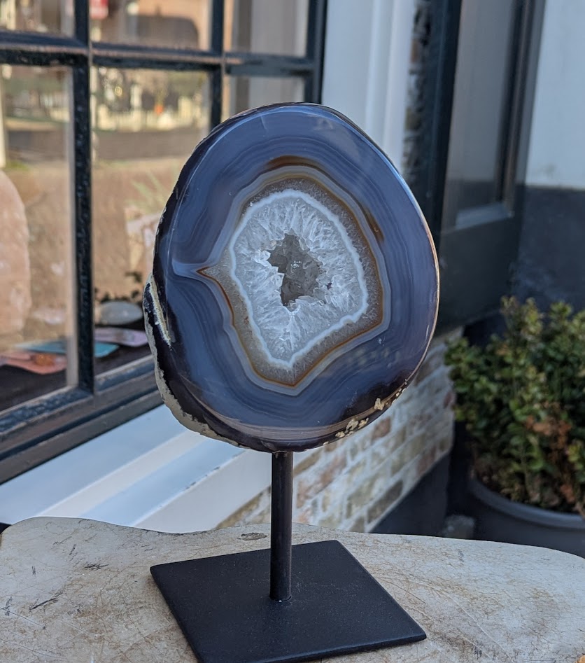 Op de foto een van de nieuwste artikelen die we momenteel hebben en waarmee we in Nederland uniek zijn: De Agaat helft op standaard.