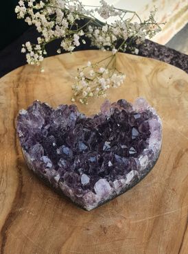 Hij is geslepen en gepolijst in een hartvorm waarbij de randen rondom gepolijst zijn waardoor je bij de randen als het ware binnenin de steen kunt zien. Het is een fijn hart maar ook met hele mooie rechtopstaande grote kristallen. Stoer toch lief.