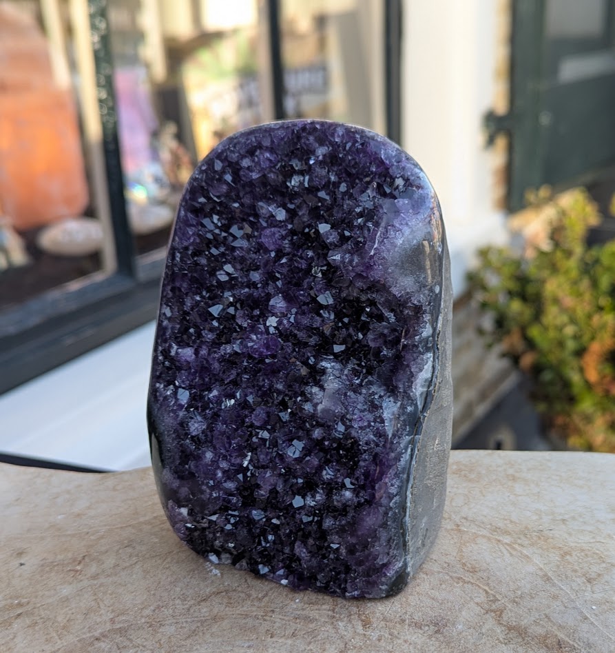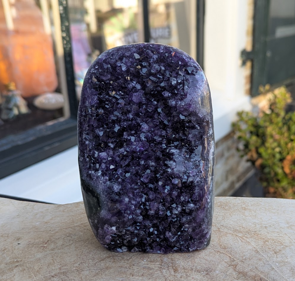 Dit soort Amethist clusters kenmerkt zich door zijn spatheldere helder en donkerpaarse kristallen met de gepolijste 'rand' van het moedergesteente langs de buitenkant die hem een extra heldere inkijk in het moedergesteente geeft en om dat zo goed mogelijk te laten zien hebben we hem van 2 kanten op de foto gezet.