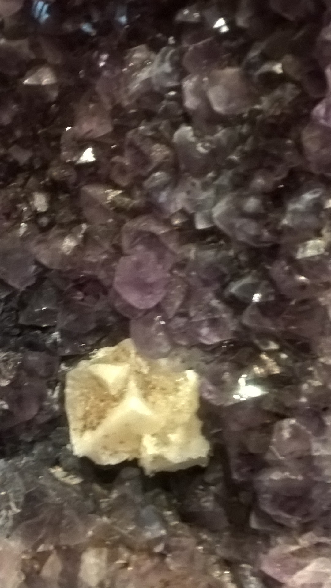 Aan groepen dwarsgegroeide Amethist kristallen die het inwendige Amethist landschap een extra afwijkend karakter geven,