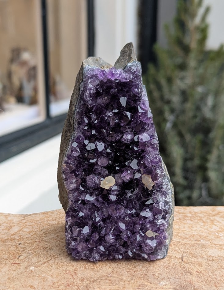 Op de foto een heel mooi staand stuk Uruguai Amethist die als een berghelling met paarse kristallen straalt, waar de energie écht vanaf spat!