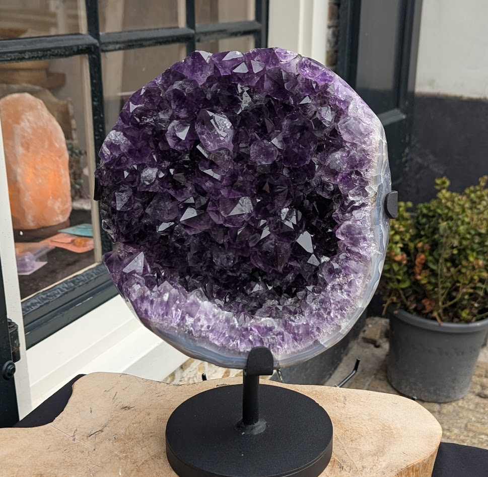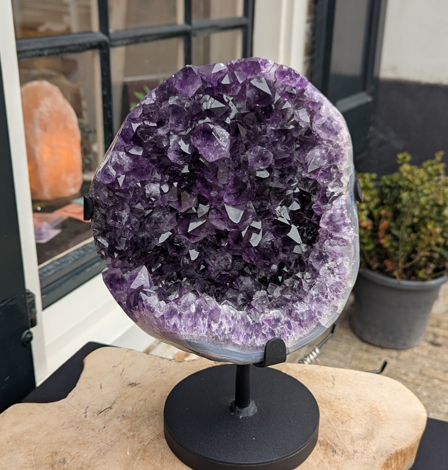 Op de foto een schitterende Cluster van super kwaliteit Uruguai Amethist in standaard!