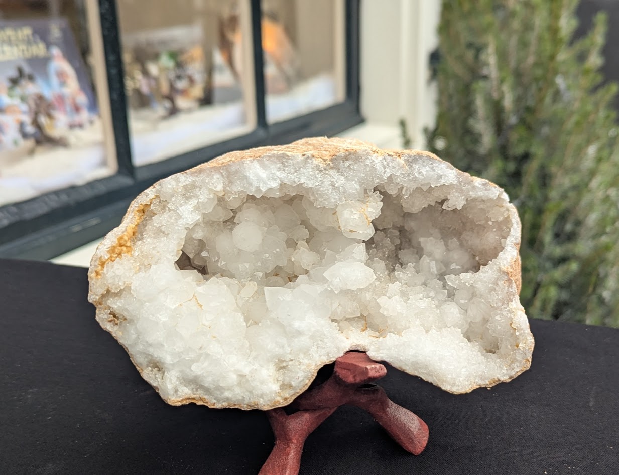 Ook heeft deze Bergkristal geode iets heel speciaals want elke Kristal Geode is uniek en heeft andere kristallen configuraties en dat uit zich bij deze Geode in wat extra clusters van kristallen die als het ware bijna los is 'gegroeid' van de binnenwand.