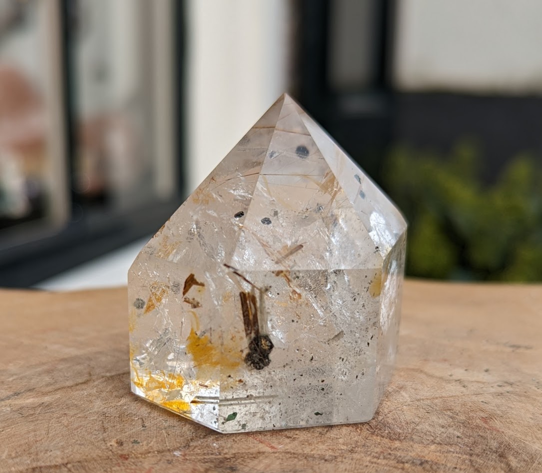 Super kwaliteit Bergkristal geslepen punt klein met limoniet en zwarte toermalijn