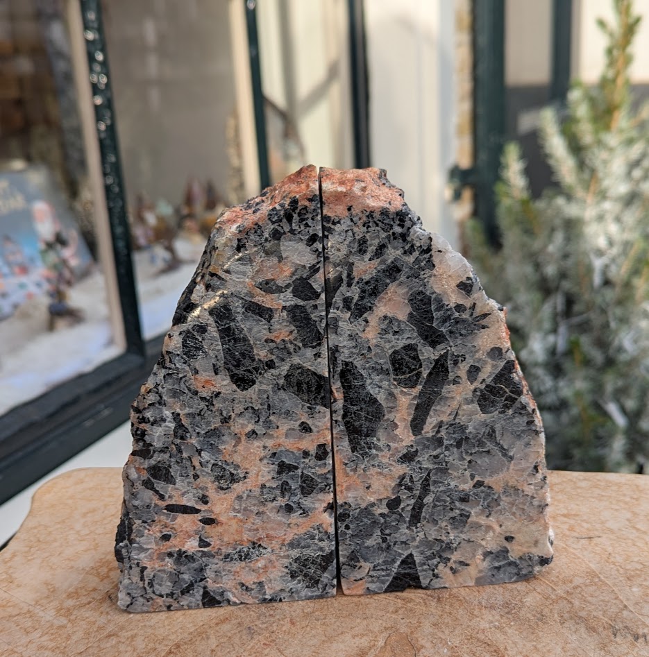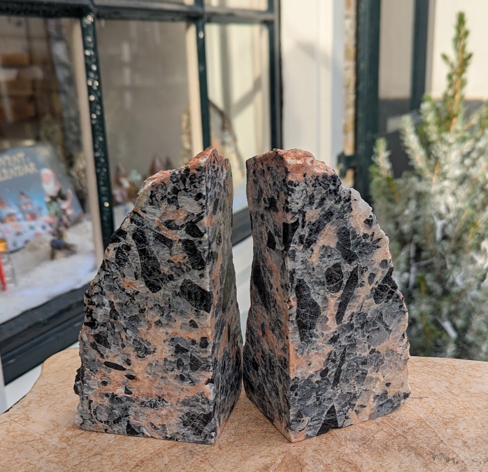 Op de foto een van onze nieuwste producten, Boekensteunen van Toermalijnkwarts.