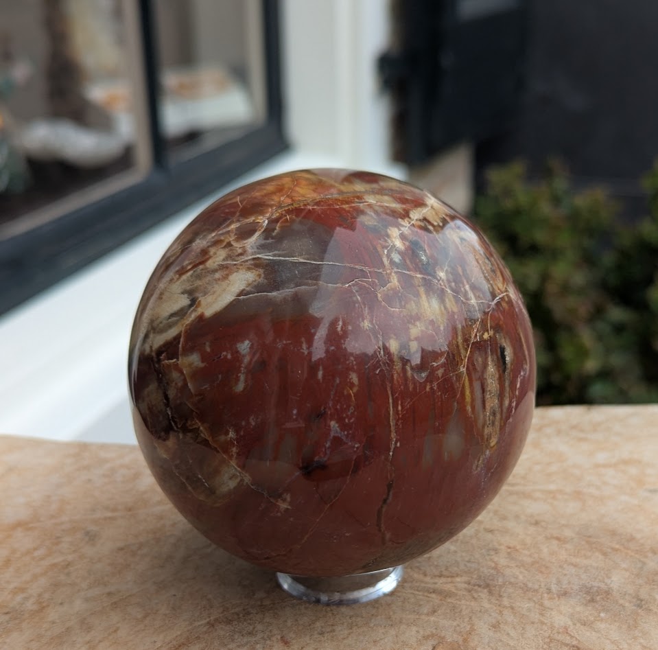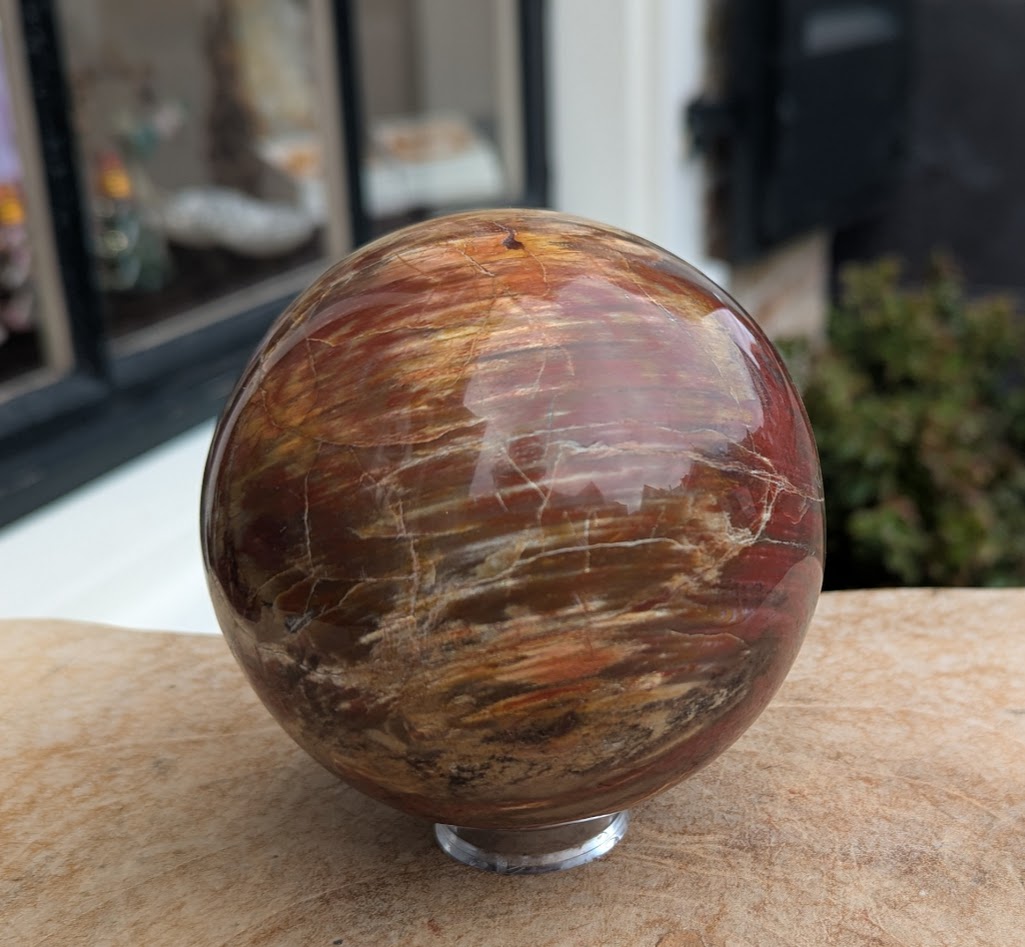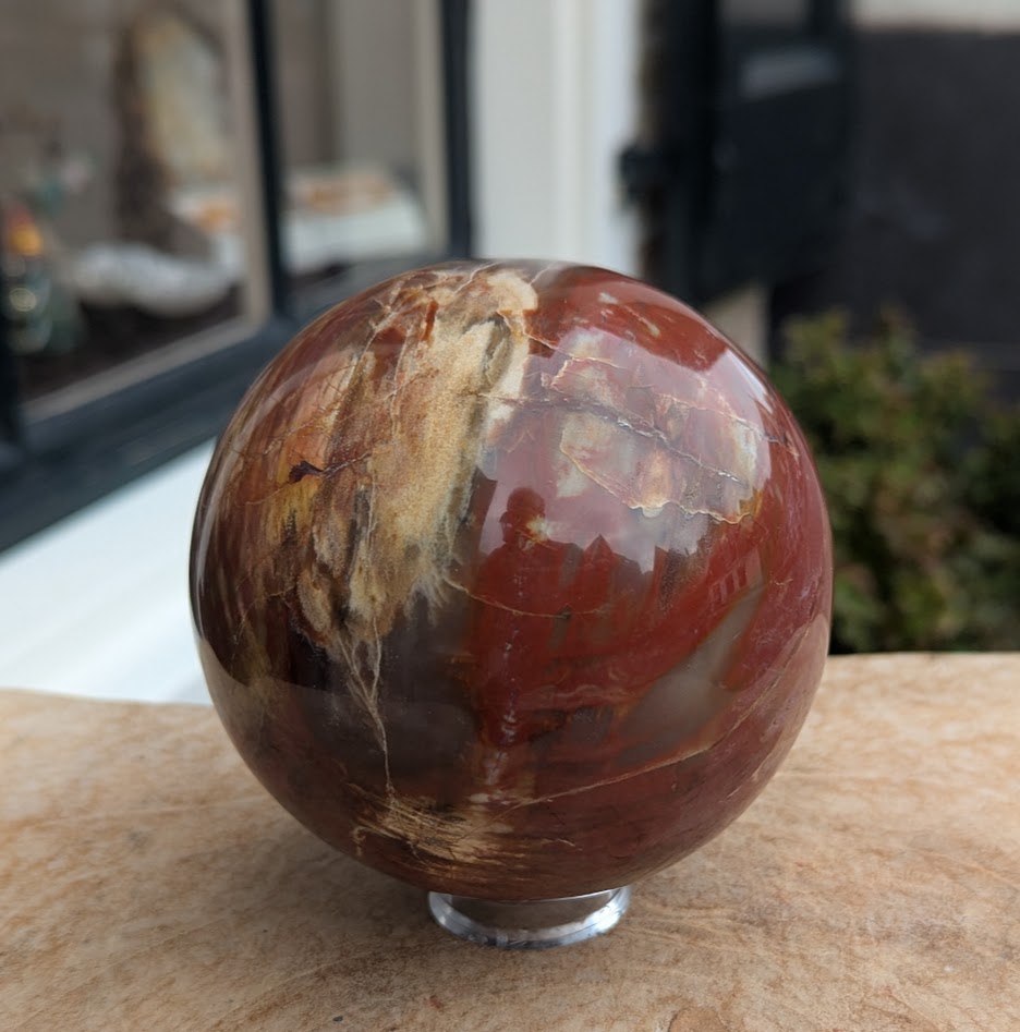Op de foto een bol van versteend hout uit Madagascar. Hij heeft een diameter van 9,5 cm