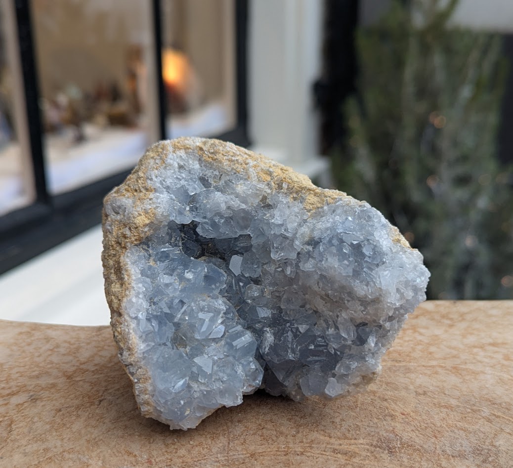 Op de foto een Celestine cluster van extra kwaliteit want deze ruwe cluster is bijzonder in zijn prachtige blauwe kristallen.