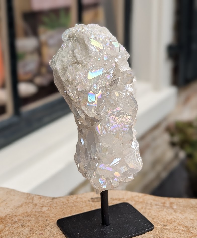 De Bergkristal Angel Aura cluster op standaard heeft de maten van 12,5 cm hoog , 6 cm breed en 7,5 cm diep, samen met de standaard is hij 16 cm hoog.Net hoe deze Angel Aura kristal wordt neergezet in het licht zal hij steeds weer anders zijn als in de mooiste film en omdat zo goed mogelijk te laten zien hebben we hem apart nog 2 keer op de foto gezet.