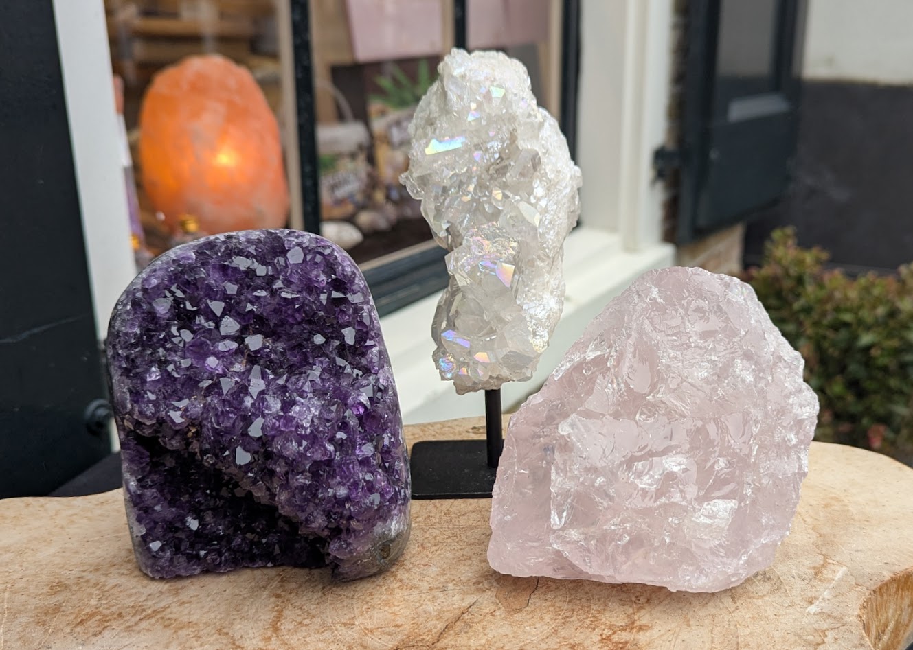 Op de foto een Magical trio Amethist, Rozekwarts en Bergkristal in een extra bijzondere opstelling!