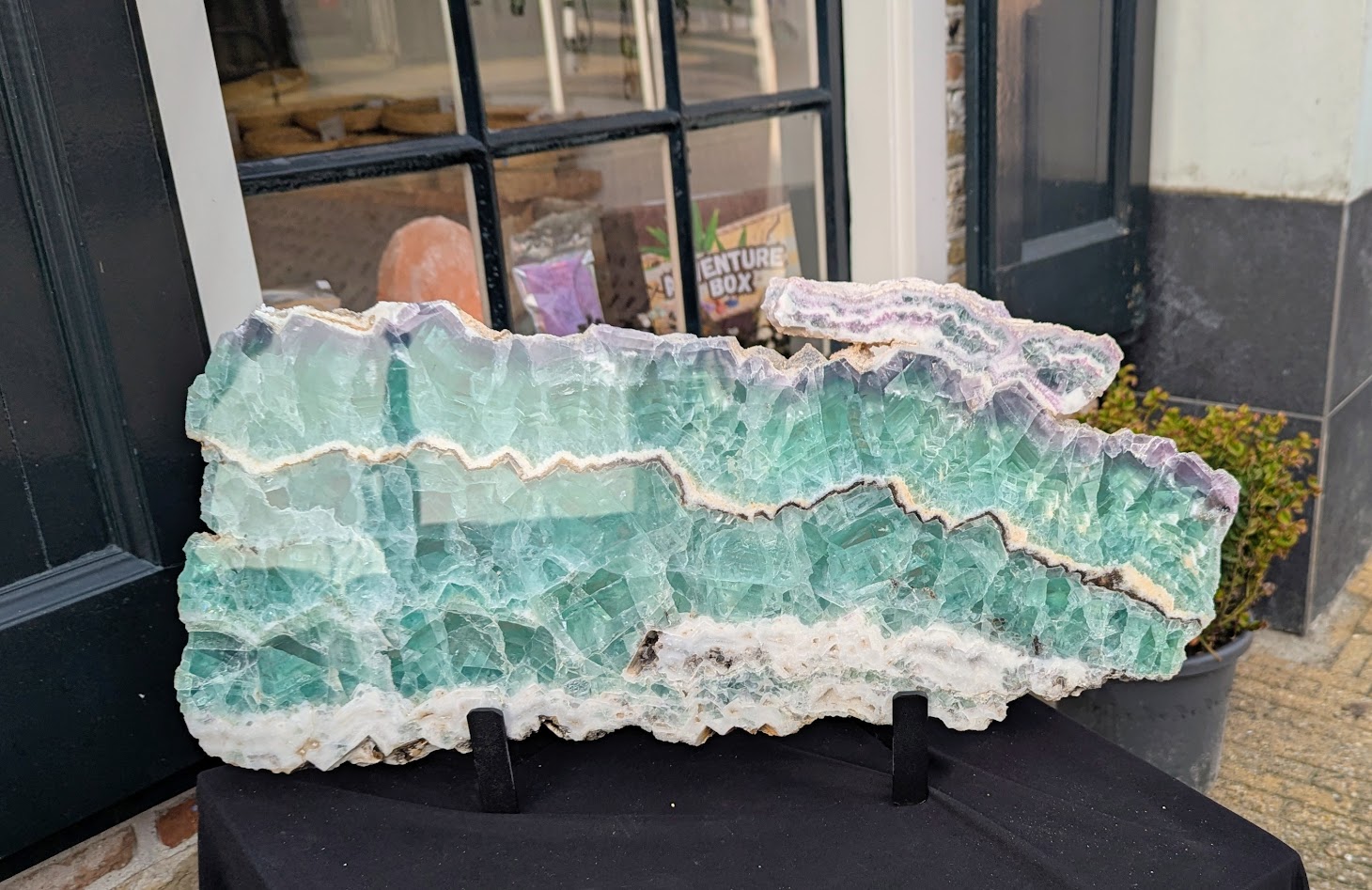 Op de foto ziet u een ruwe schijf Groene fluoriet in de extra kwaliteit en de XXL maat op standaard
