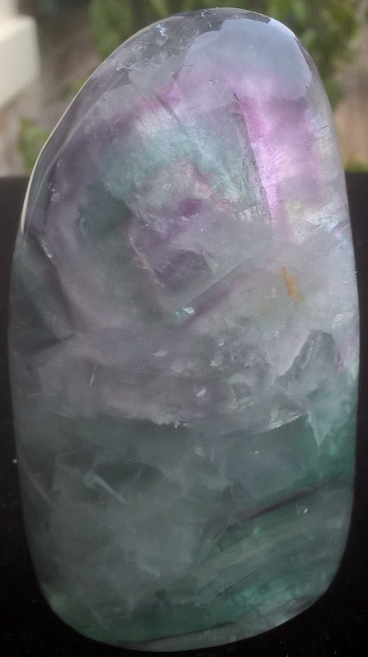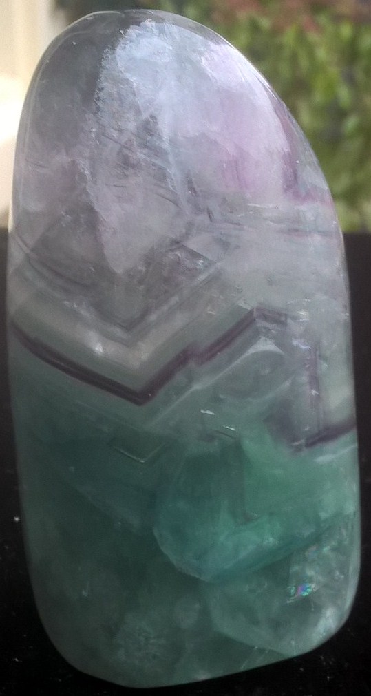 Op de foto een Freeform figuur van een bijzondere heldere kwaliteit Groene Fluoriet gemengt met Paarse Fluoriet gemaakt in gewoon daglicht.