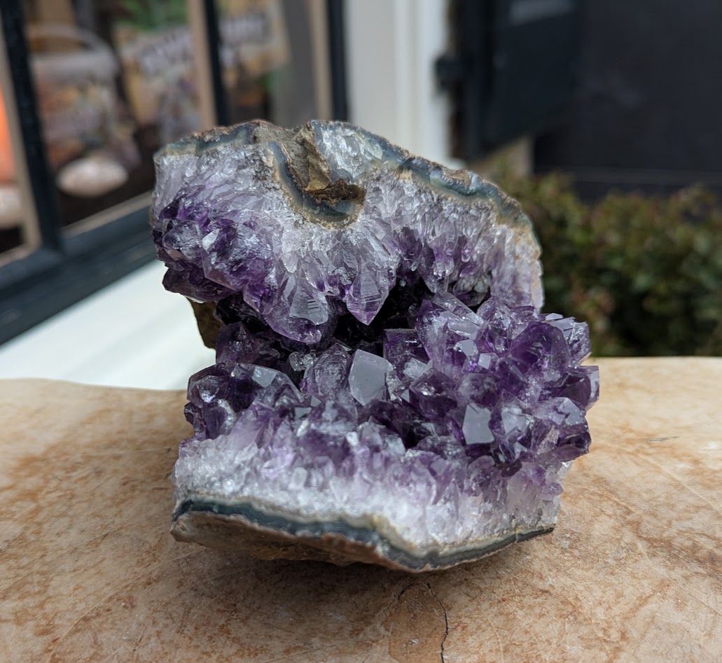 De Uruguai Amethist is zowel een cluster als een geode en heeft de maten van 10 cm breed, 13,5 cm diep en 11 cm hoog.Deze cluster heeft de prachtig stralende dieppaarse kristallen die het binnenste van deze ruwe steen met het ruwe moedergesteente boven en onder op de foto. Het schitterende Amethist veld wordt écht omkranst door het extra ruwe moedergesteente dat het een extra dimensie geeft in kracht en natuur, echt heel bijzonder en om dit zo goed mogelijk te laten zien hebben we deze bijzondere cluster extra op de foto gezet!