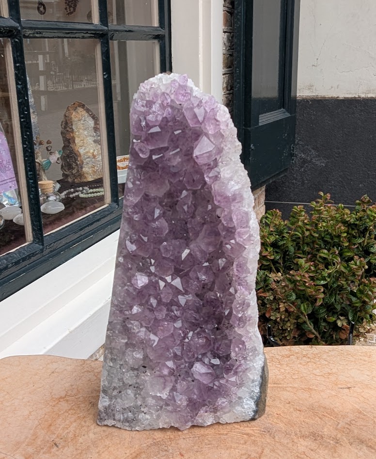 De Amethist is 10,5 cm breed, 9 diep en 19 cm hoog en is van de extra ruwe puur natuur kwaliteit met 'satijnzacht'paarse kristallen van Uruguai Amethist.