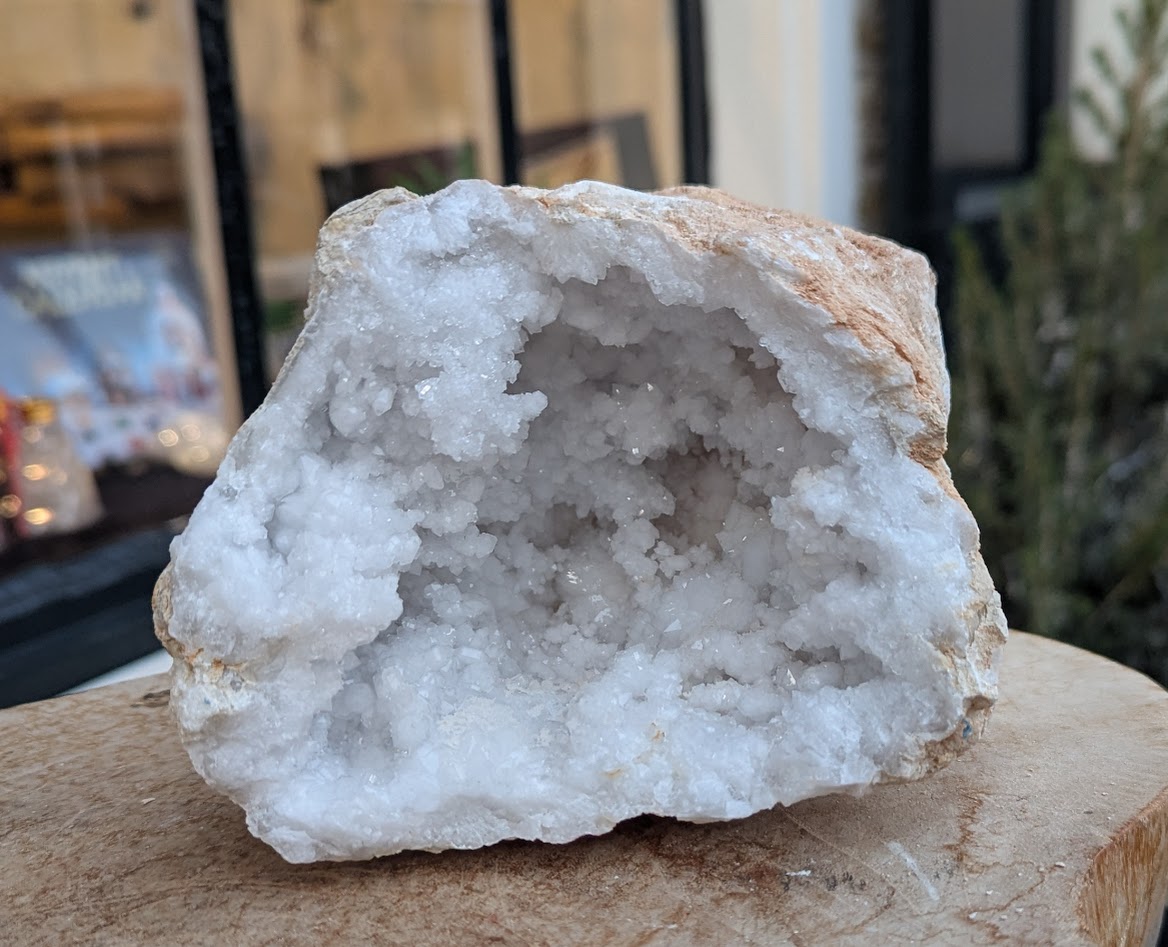 Het mooie van deze kristal geode is ook vooral zijn zachte 'sneeuwachtige' uitstraling!