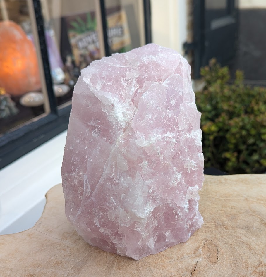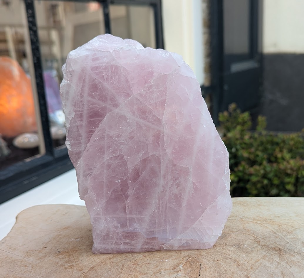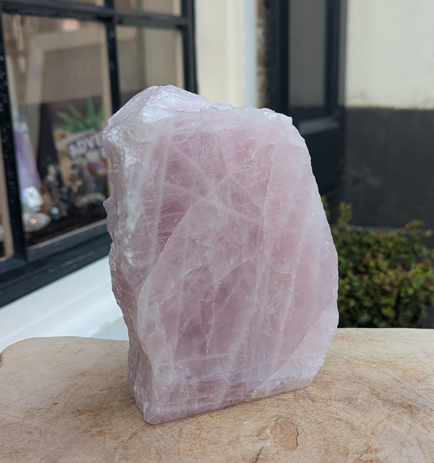 Op de foto's een stuk ruwe Rozekwarts in de large maat dat aan één kant gepolijst is, met de maten 16,5 cm hoog, 12,5 cm breed en 7 cm dik.