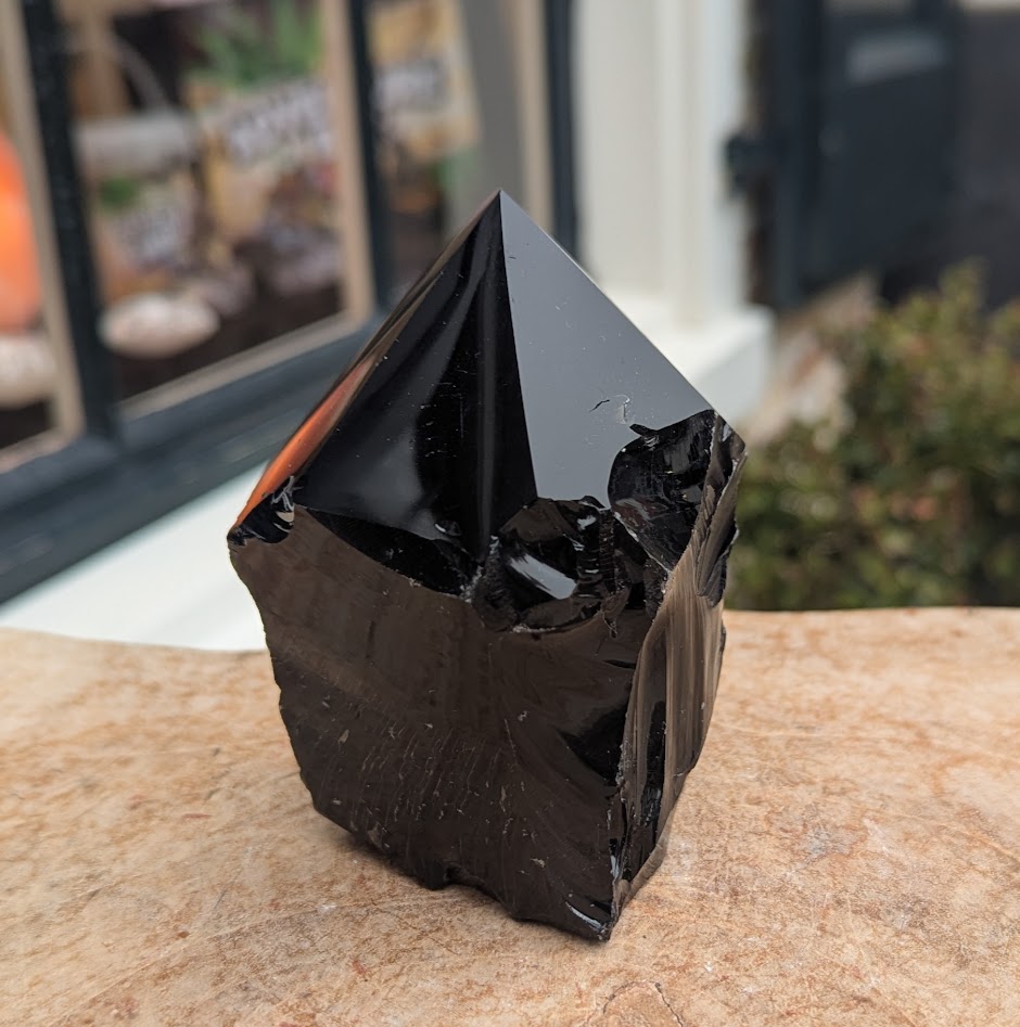 Op de foto een van onze nieuwste artikelen, de ruwe versie van Zwarte Obsidiaan uit Brazilie in een ruw stuk met een geslepen punt.
